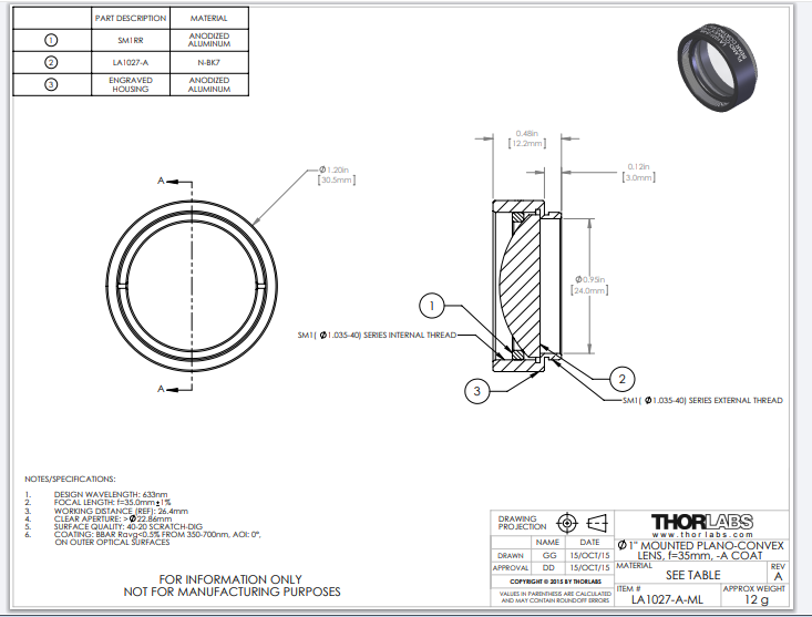 Thorlabs索雷博 LA1027-A-ML 平凸透镜