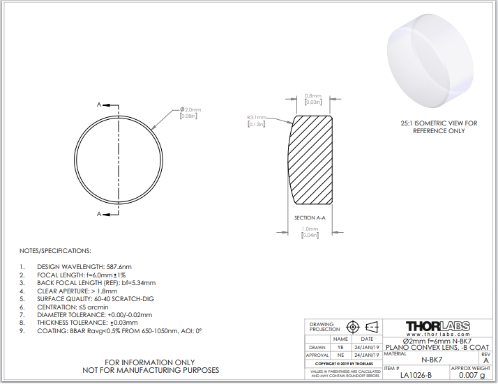 Thorlabs索雷博 LA1026-B 平凸透镜