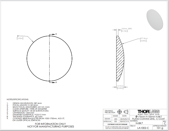 Thorlabs索雷博 LA1002-C 平凸透镜