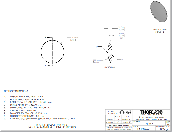 Thorlabs索雷博 LA1002-AB 平凸透镜