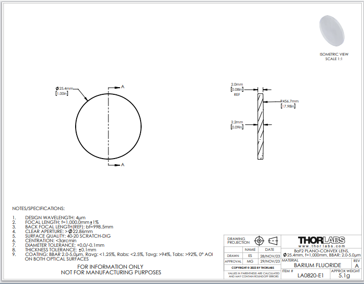 Thorlabs索雷博 LA0820-E1 平凸透镜