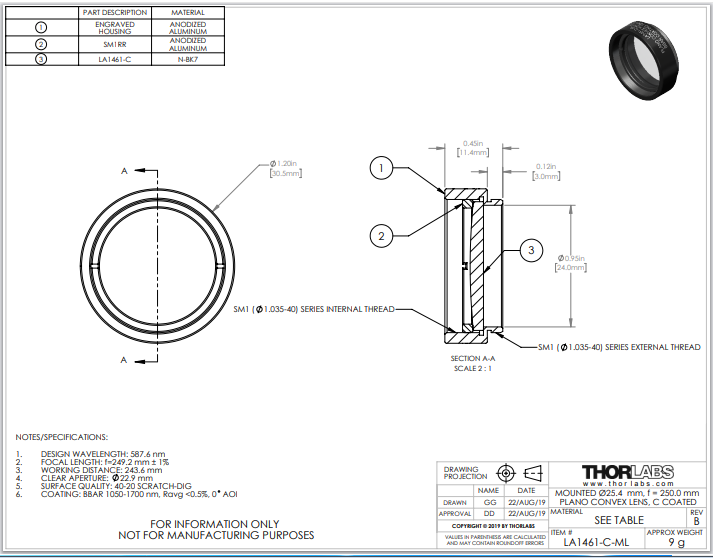 Thorlabs索雷博 LA1 461-C-ML 平凸透镜