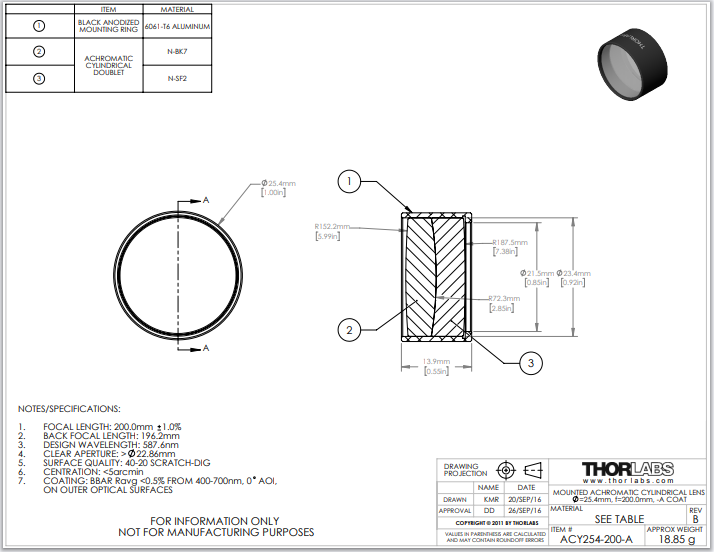 Thorlabs索雷博 ACY254-200-A 柱面消色差透镜