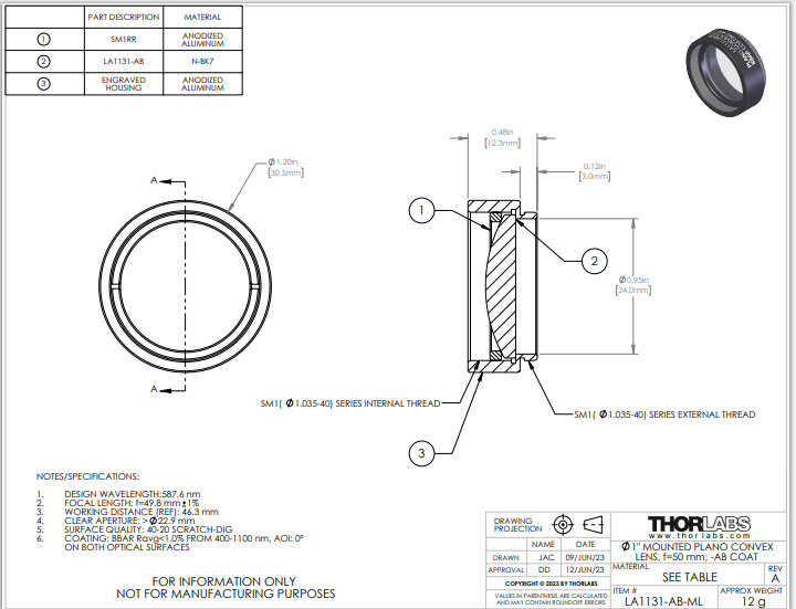 Thorlabs索雷博 LA1131-AB-ML 平凸透镜