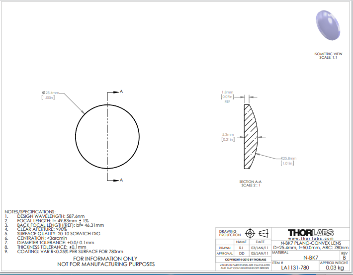 Thorlabs索雷博 LA1131-780 平凸透镜