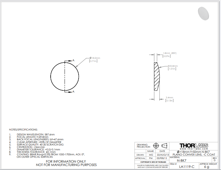 Thorlabs索雷博 LA1119-C 平凸透镜