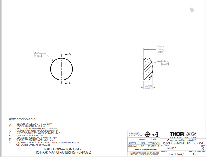 Thorlabs索雷博 LA1116-C 平凸透镜