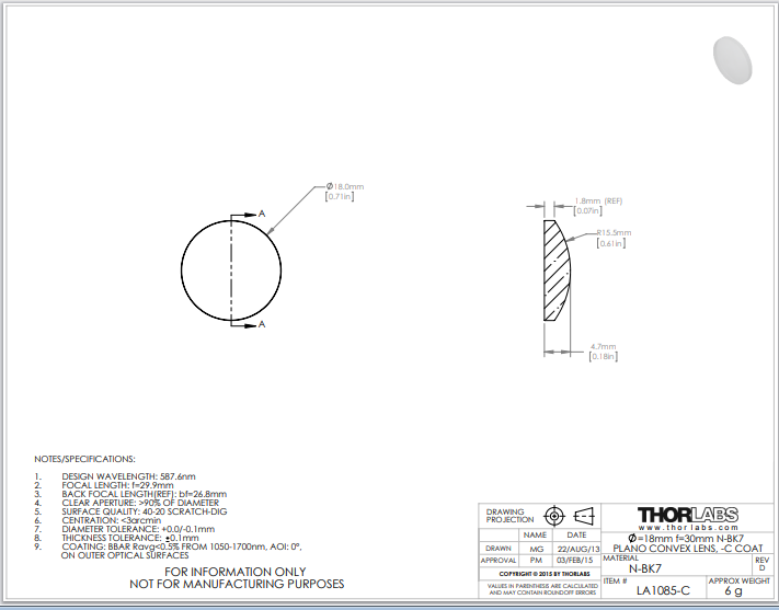 Thorlabs索雷博    LA1085-C   平凸透镜
