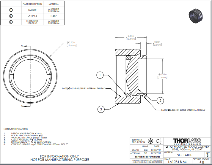Thorlabs索雷博 LA1074-B-ML 平凸透镜