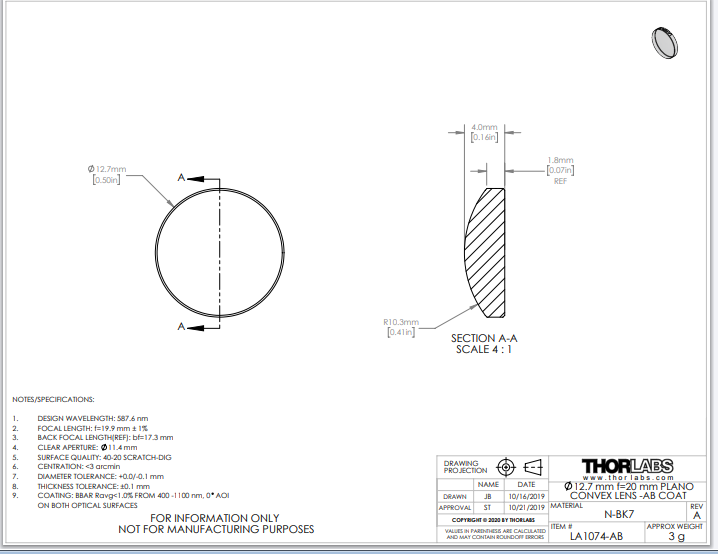 Thorlabs索雷博 LA1074-AB 平凸透镜