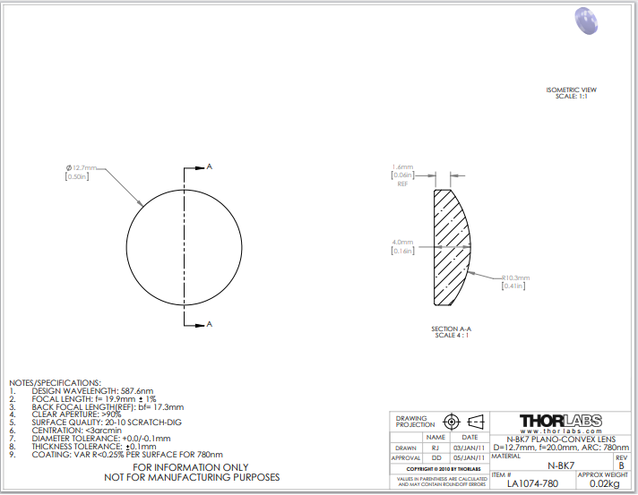 Thorlabs索雷博    LA1074-780   平凸透镜