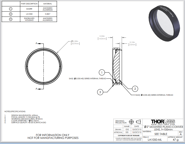 Thorlabs索雷博 LA1050-ML 平凸透镜