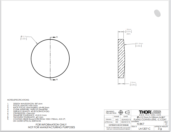 Thorlabs索雷博 LA1207-C 平凸透镜