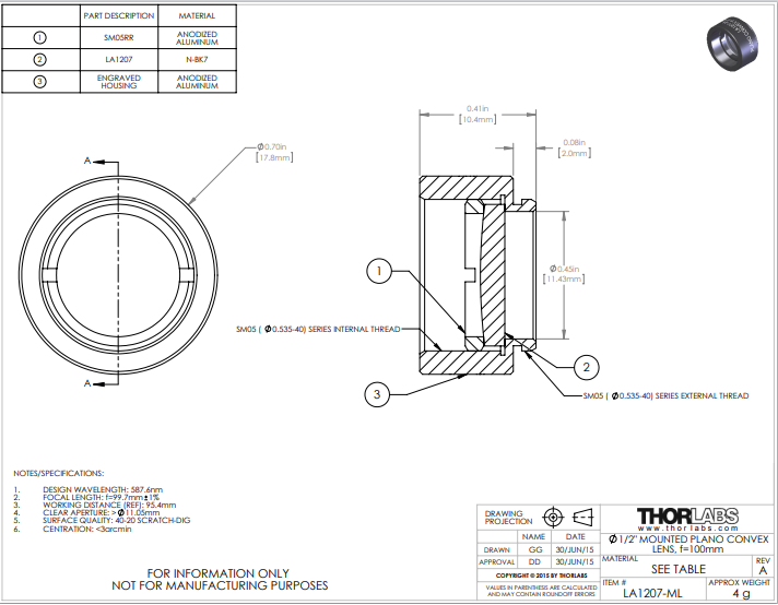 Thorlabs索雷博 LA1207-ML 平凸透镜
