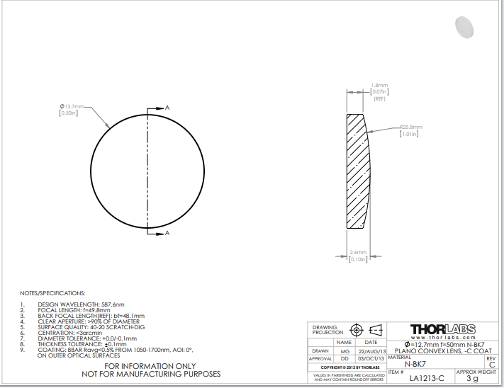 Thorlabs索雷博    LA1213-C   平凸透镜