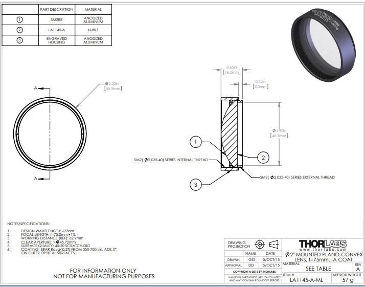 Thorlabs索雷博 LA1145-A-ML 平凸透镜