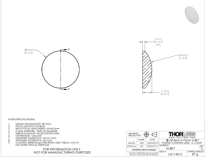 Thorlabs索雷博 LA1145-C 平凸透镜