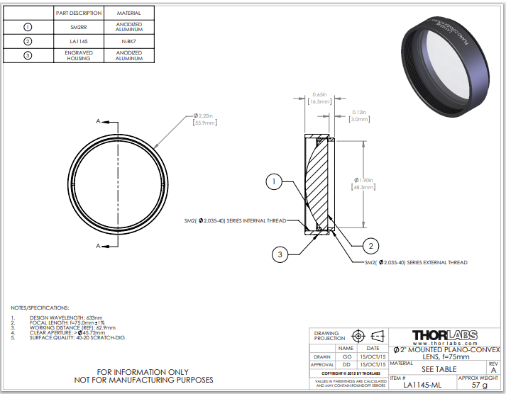 Thorlabs索雷博 LA1145-ML 平凸透镜