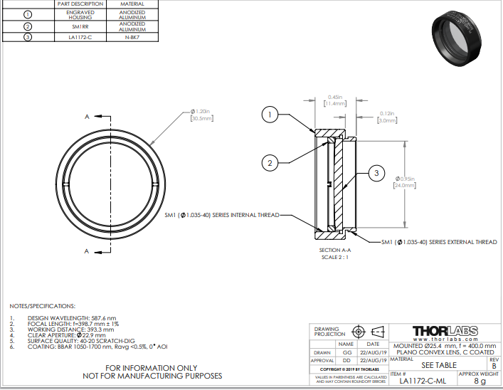 Thorlabs索雷博 LA1172-C-ML 平凸透镜