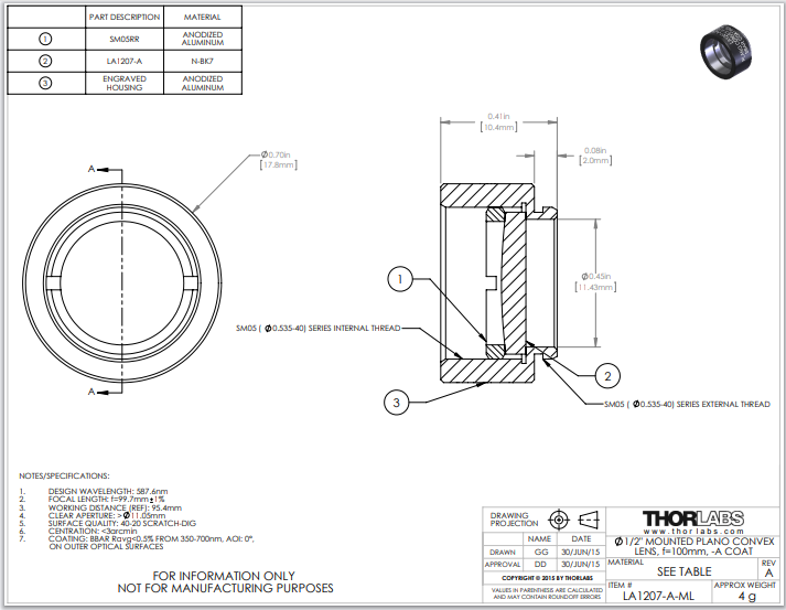 Thorlabs索雷博 LA1207-A-ML 平凸透镜