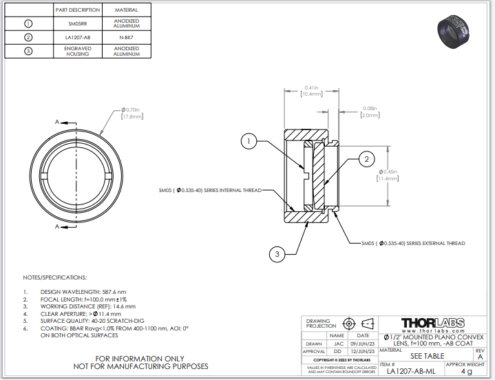 Thorlabs索雷博 LA1207-AB-ML 平凸透镜