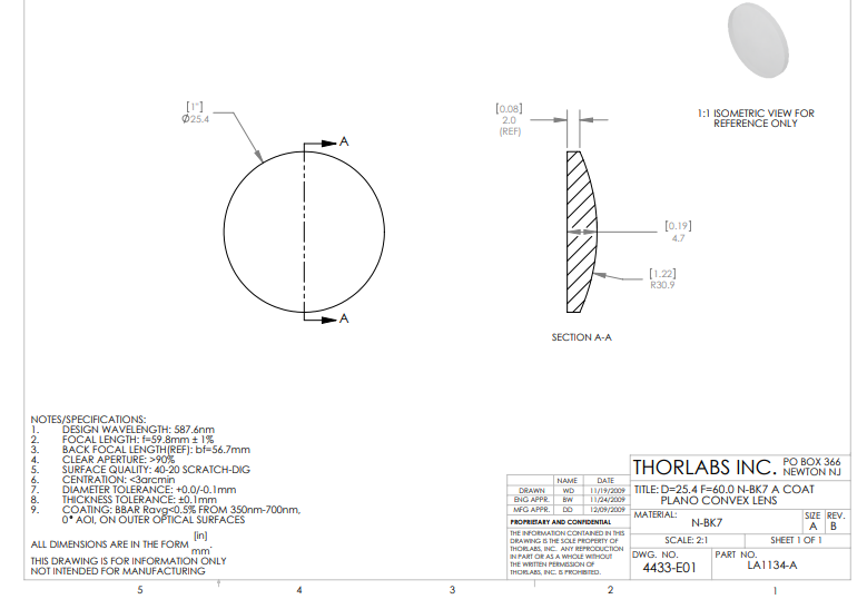 Thorlabs索雷博 LA1134-A 平凸透镜