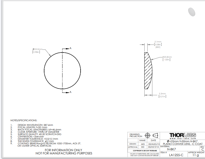 Thorlabs索雷博 LA1255-C 平凸透镜
