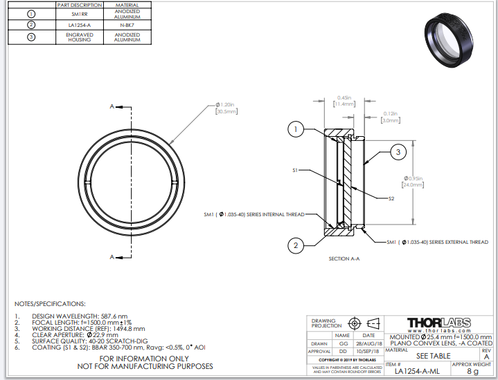 Thorlabs索雷博    LA1254-A-ML   平凸透镜