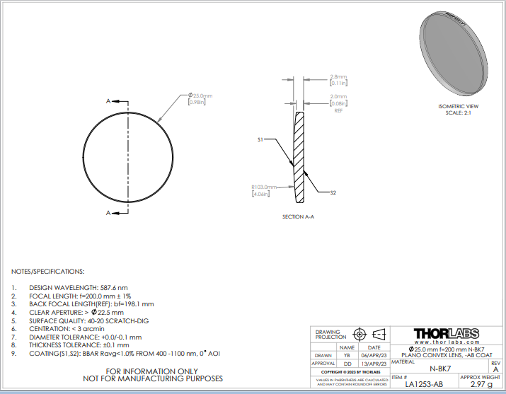 Thorlabs索雷博 LA1253-AB 平凸透镜
