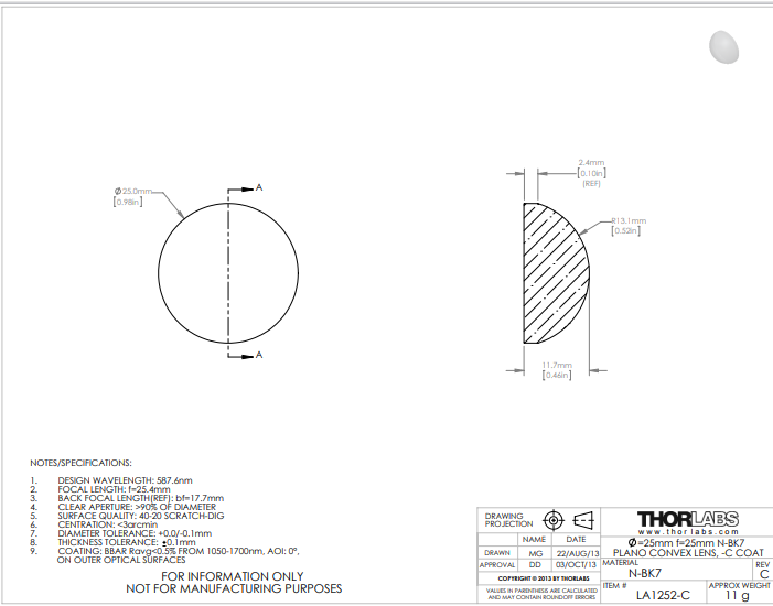 Thorlabs索雷博 LA1252-C 平凸透镜