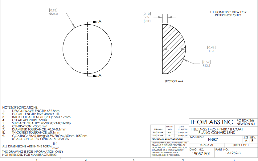 Thorlabs索雷博 LA1252-B 平凸透镜