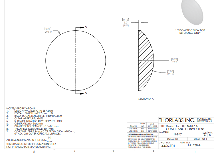 Thorlabs索雷博 LA1238-A 平凸透镜