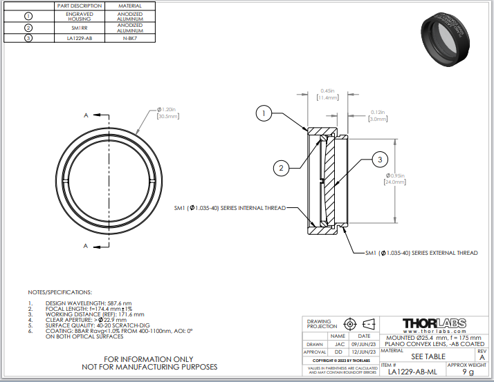 Thorlabs索雷博 LA1229-AB-ML 平凸透镜