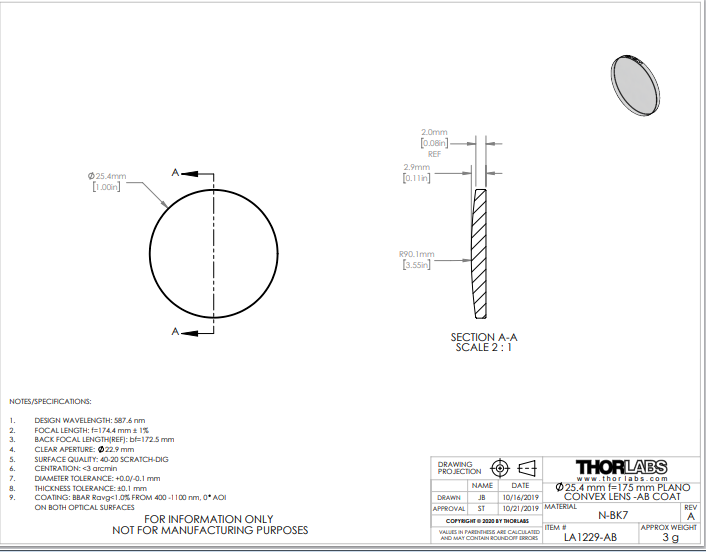 Thorlabs索雷博 LA1229-AB 平凸透镜
