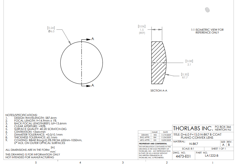 Thorlabs索雷博 LA1222-B 平凸透镜