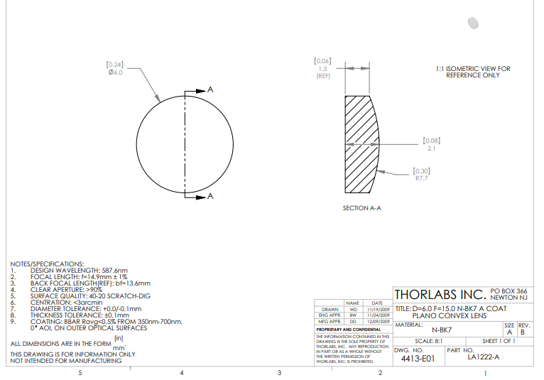 Thorlabs索雷博    LA1222-A   平凸透镜