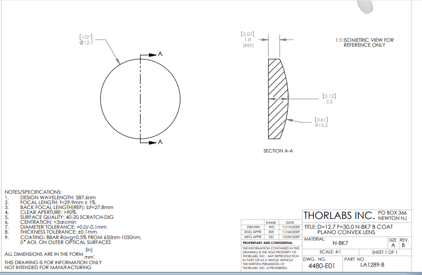 Thorlabs索雷博 LA1289-B 平凸透镜