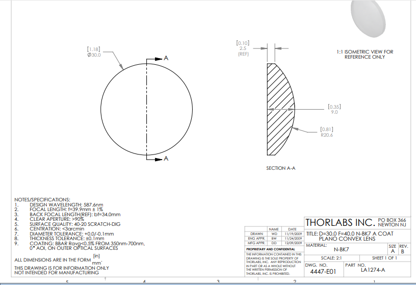 Thorlabs索雷博    LA1274-A   平凸透镜