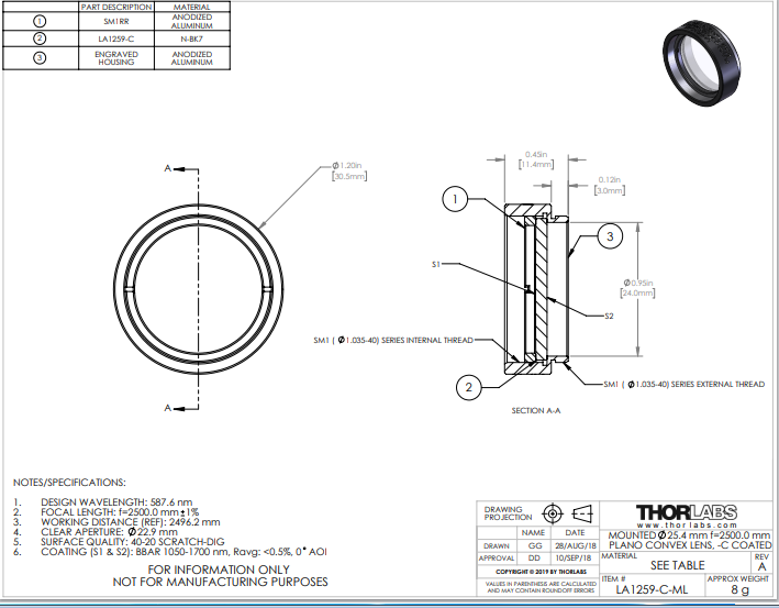Thorlabs索雷博 LA1259-C-ML 平凸透镜