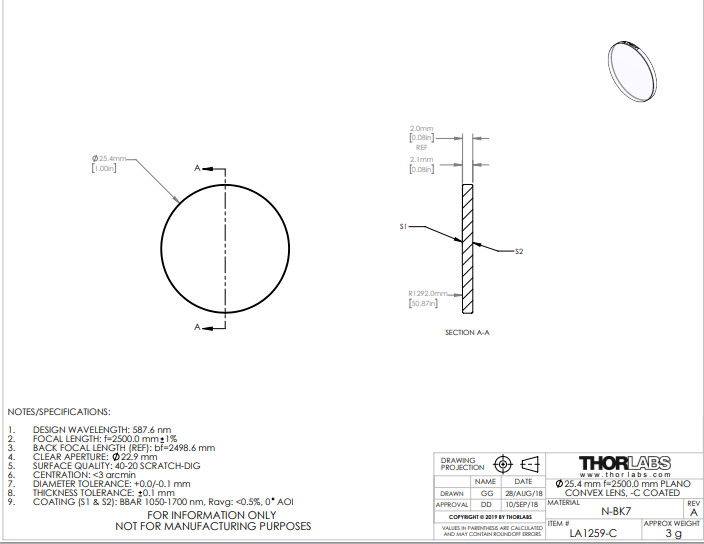 Thorlabs索雷博 LA1259-C 平凸透镜