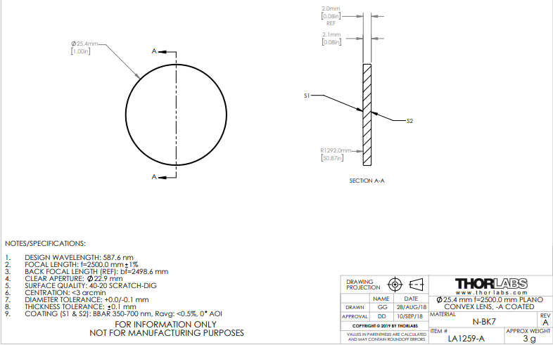 Thorlabs索雷博 LA1259-A 平凸透镜