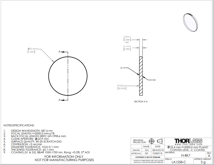 Thorlabs索雷博 LA1258-C 平凸透镜
