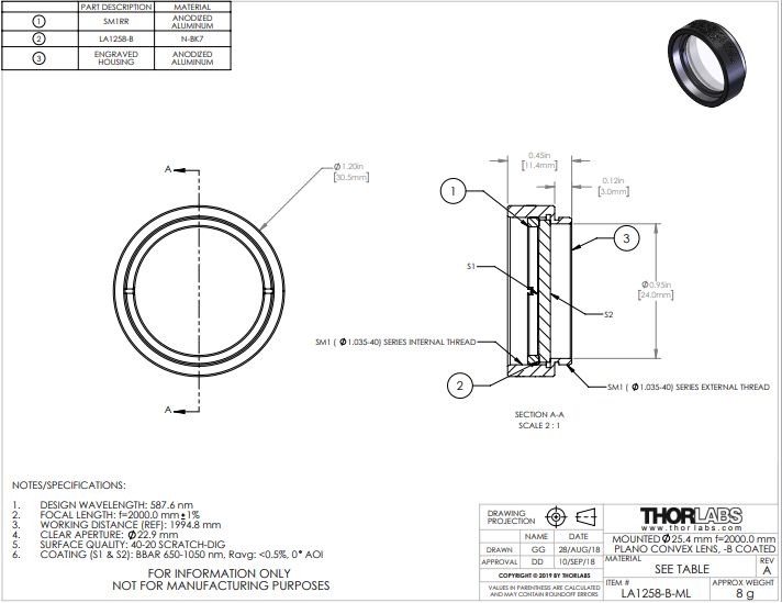 Thorlabs索雷博 LA1258-B-ML 平凸透镜