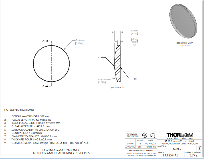 Thorlabs索雷博 LA1257-AB 平凸透镜