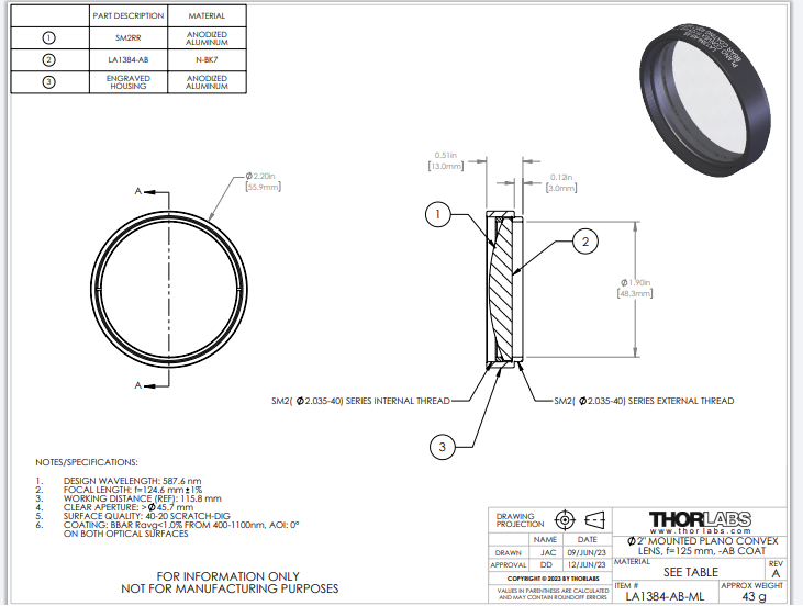 Thorlabs索雷博    LA1384-AB-ML   平凸透镜