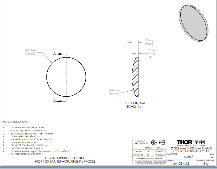 Thorlabs索雷博 LA1384-AB 平凸透镜