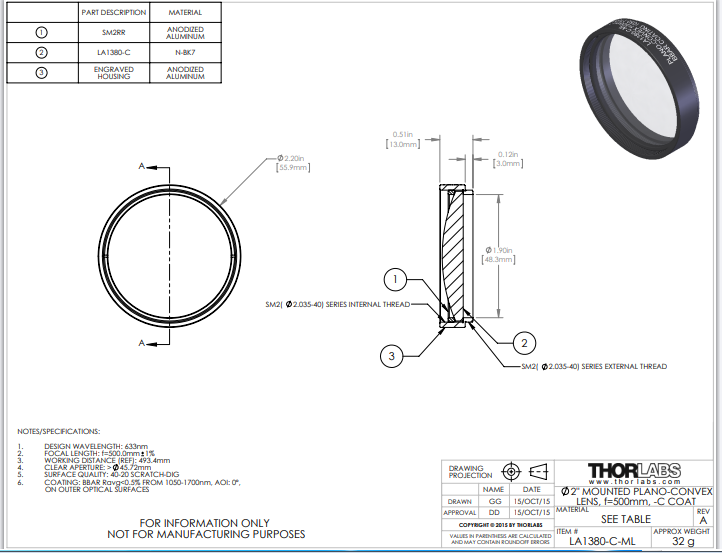 Thorlabs索雷博 LA1380-C-ML 平凸透镜