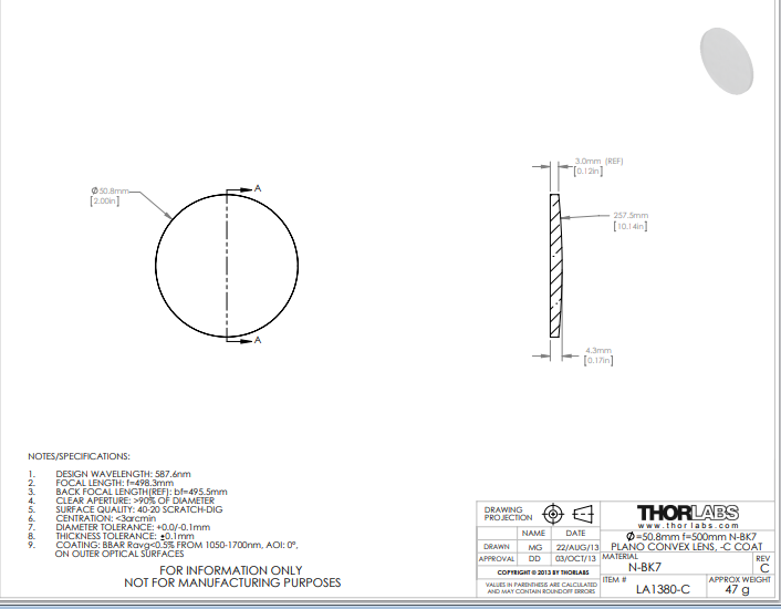 Thorlabs索雷博 LA1380-C 平凸透镜