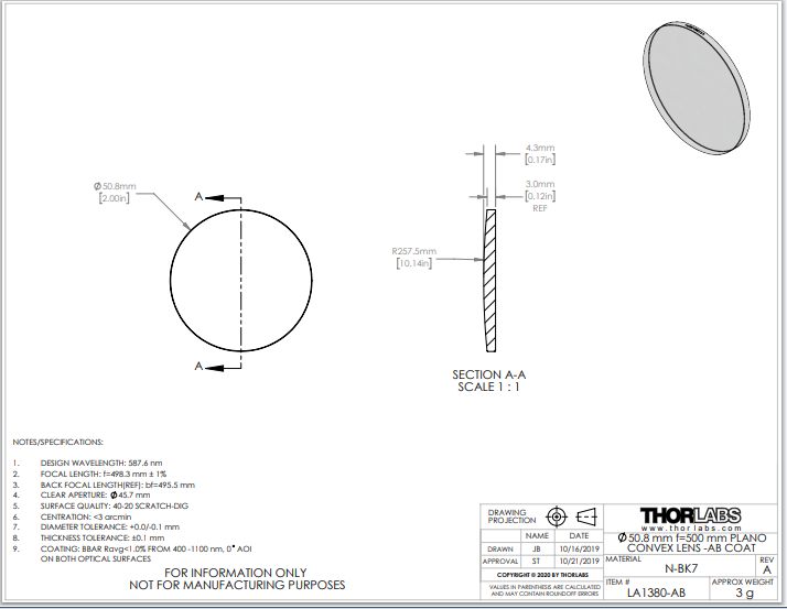 Thorlabs索雷博 LA1380-AB 平凸透镜