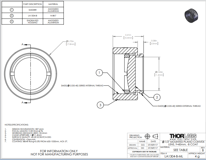 Thorlabs索雷博 LA1304-B-ML 平凸透镜